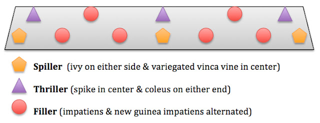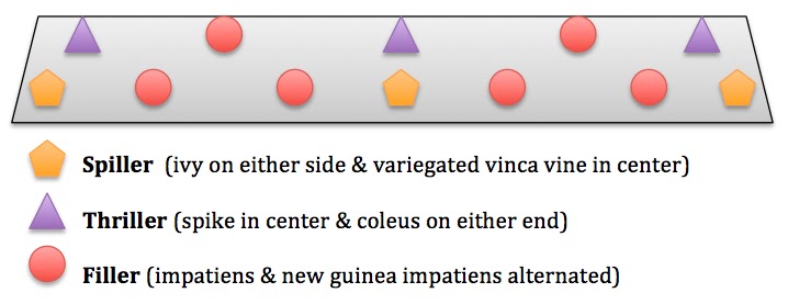 With these key ingredients in mind, plant placement is also important so the plants will grow and thrive. The following diagram shows the plant arrangement I used in my window boxes (plant names I used are in parentheses) :