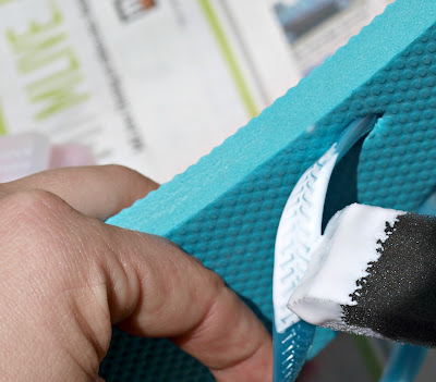 Starting at one side of your flip flop, brush on a few inches of Mod Podge. Sprinkle glitter generously.