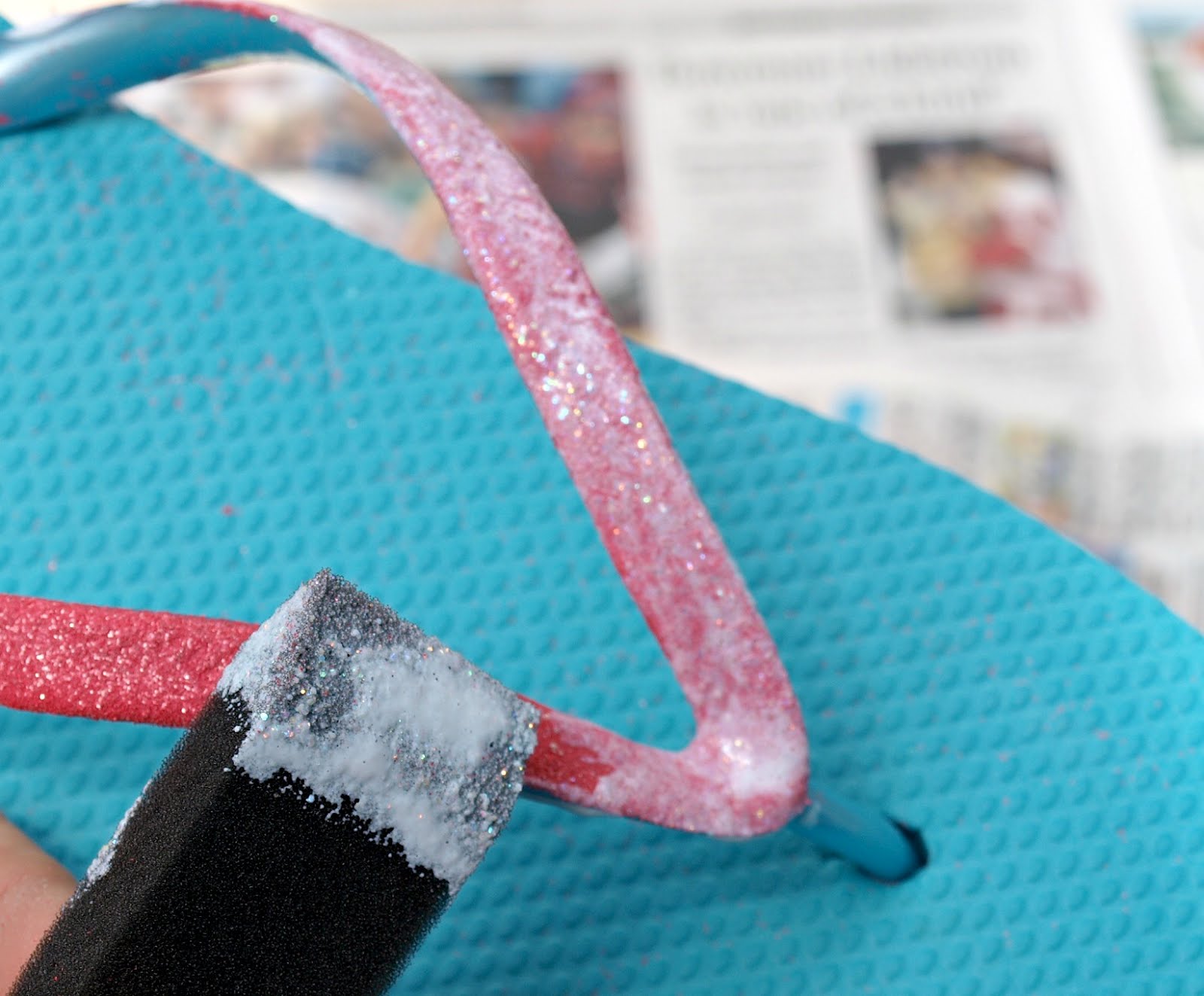 Starting at one side of your flip flop, brush on a few inches of Mod Podge. Sprinkle glitter generously.