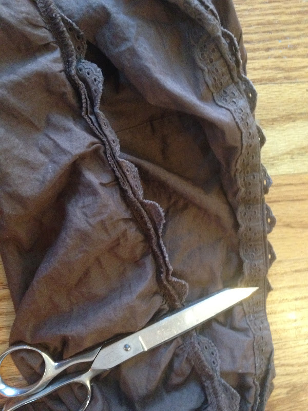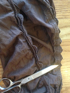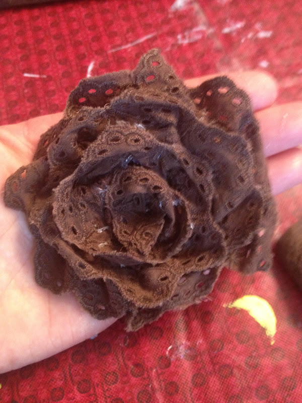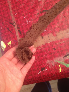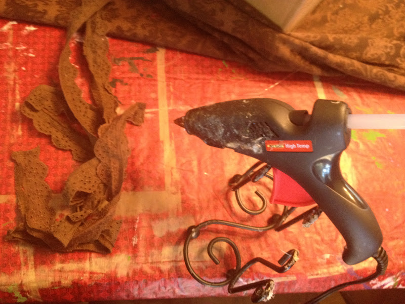 While the paint dried, I started working on my fabric flowers. First I started by cutting the lace off of an old tie sweater.