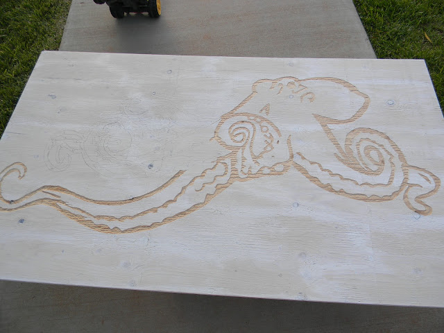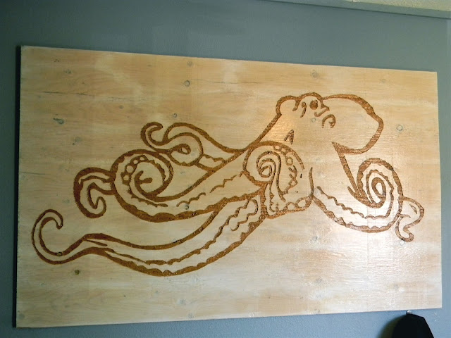 So here’s how, the how to goes. Take gigantic piece of plywood, I choose to white wash this bad boy first. Then I got my octopus outline printed it on a transparency (which you can juct do from your printer)