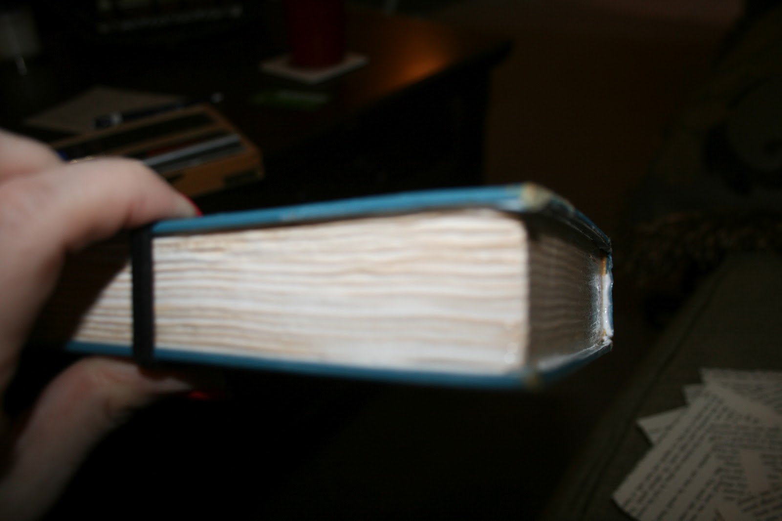 Then I realized that first, I was going to make a giant mess and second, I should have glued my book together first. So, I grabbed a few more supplies and continued working. I needed something to hold my book closed tightly so I grabbed an elastic headband and wrapped it around the book twice. I grabbed my Mod Podge and a foam brush and brushed on glue on the three sides of the exposed pages. I gave it an hour or so to dry and got back to cutting pages. I would probably do this step first if I attempt this project again.