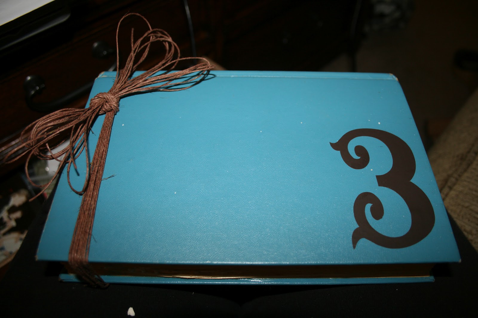 It took a really long time to cut my pages out – I would test it to see if I was deep enough and wouldn’t be, so back to slicing pages away. Finally, once it was deep enough, I decided to decorate the front of the book. There are three of us in our family so I cut out a three from some brown vinyl and added a twine bow.