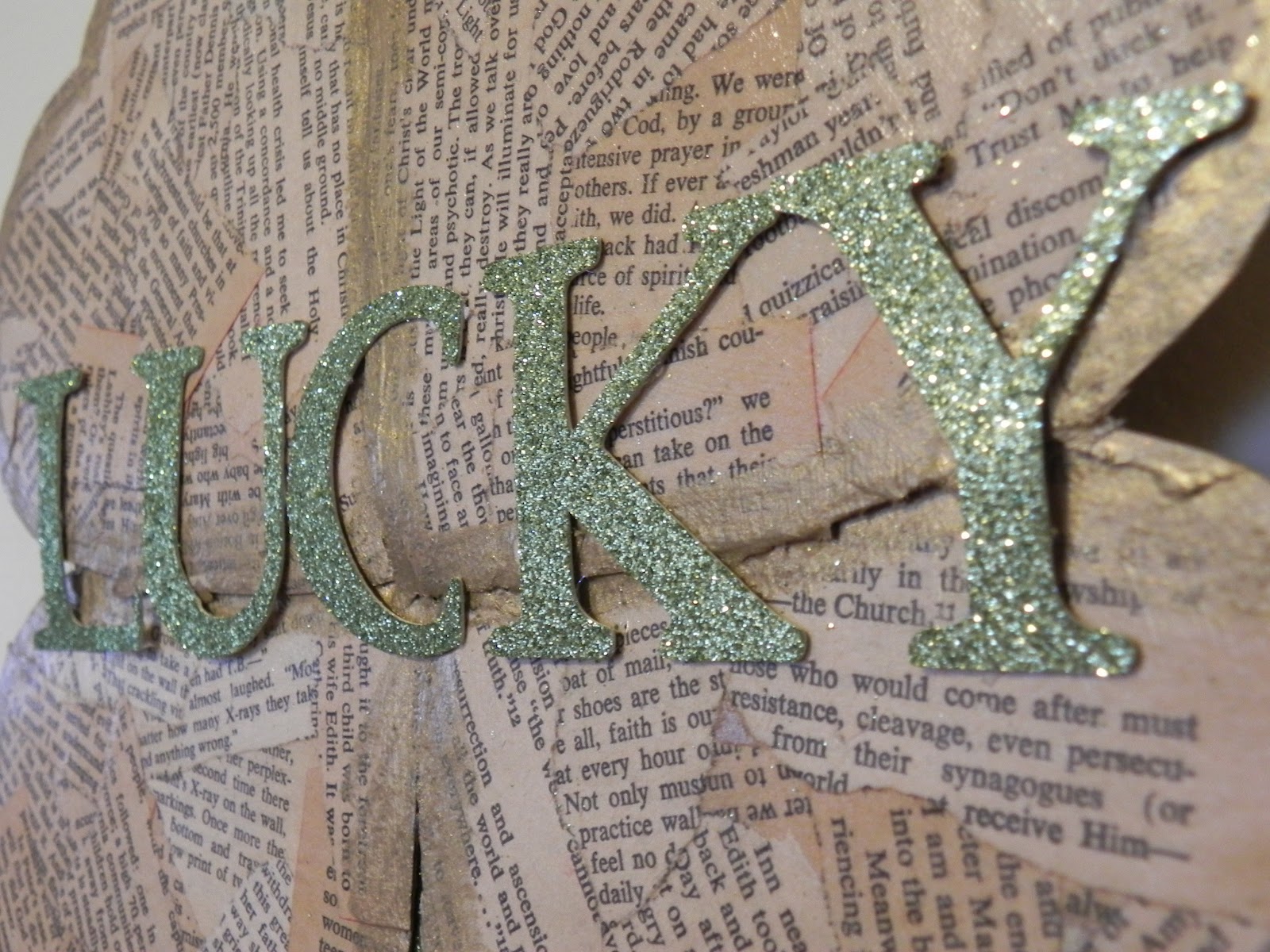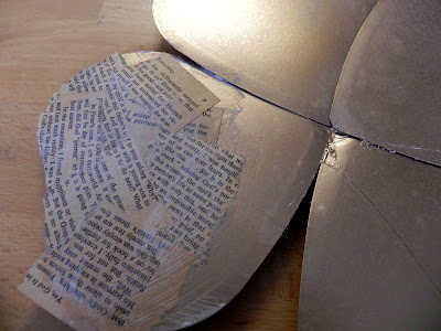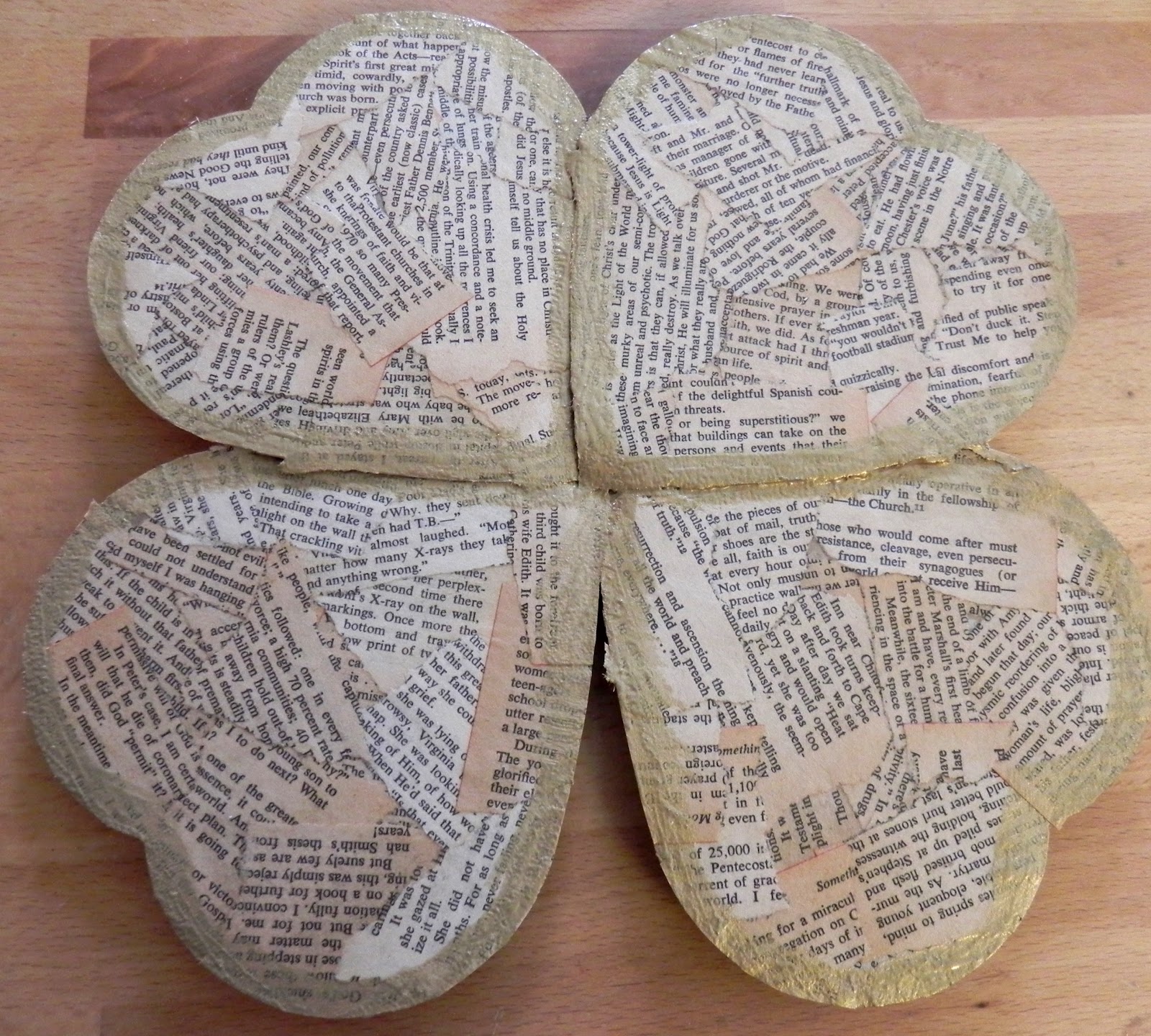 I grabbed a book for 25 cents at a local chuch thrift shop. I tore out the pages and used Mod Podge in glossy finish.