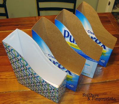 Just paint or use scrapbook paper that coordinates with your color scheme. These are from detergent boxes but you could use cereal boxes too. Clever!!!