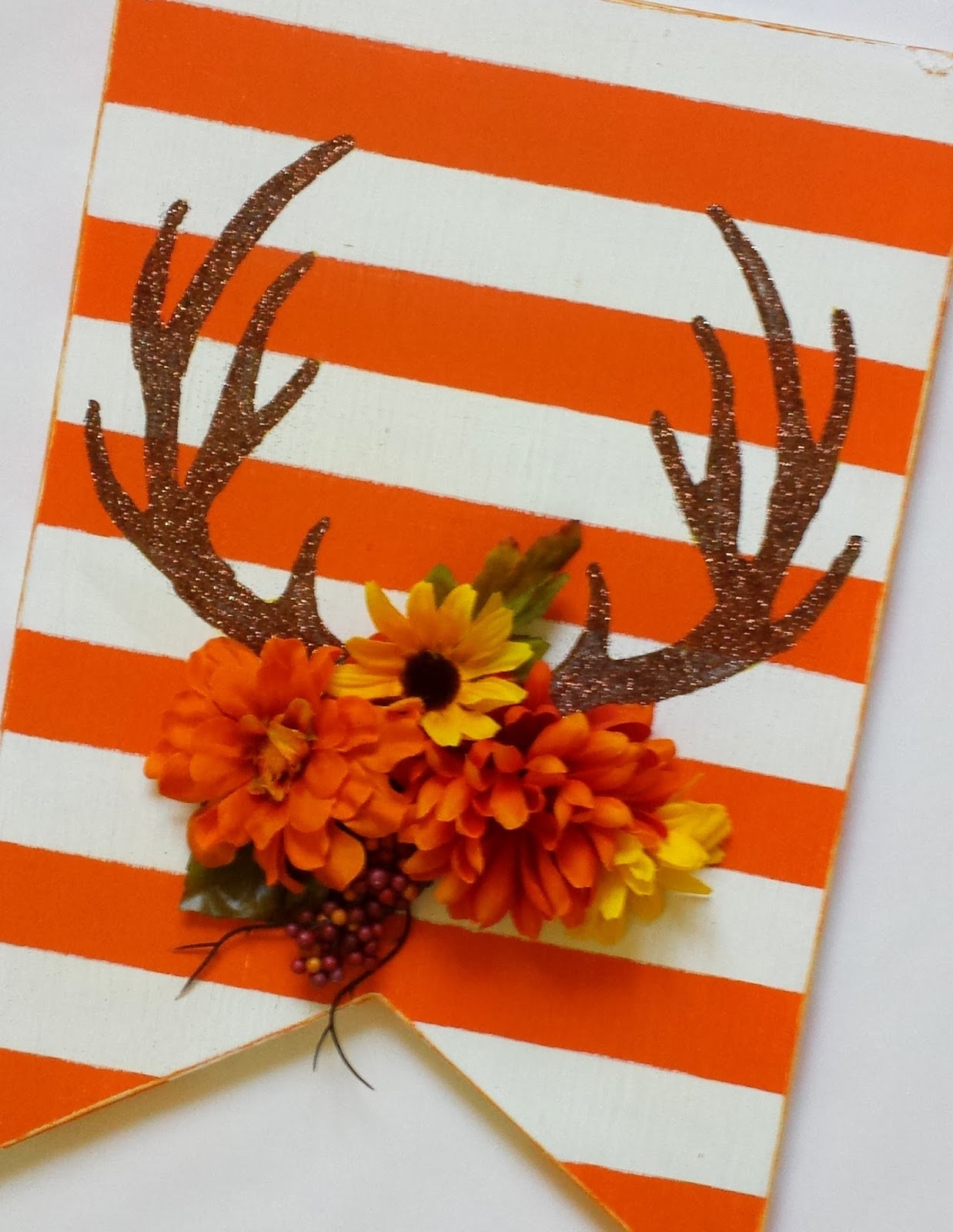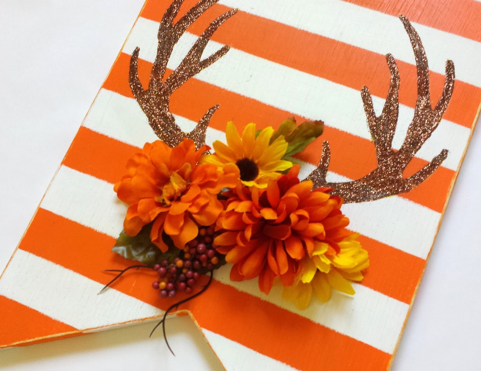 Paint your base color then measure & tape off your lines to paint. To make the antlers, trace your use a vinyl stencil. Working a little bit at a time, apply glue and then glitter, shaking off before applying more glue to other sections.