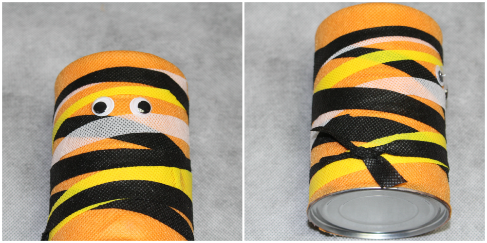 I took the scraps fabrics and cut strips to embellish the cans. At this point you can add wiggly eyes, buttons or gemstones. Get creative and use what you have in your craft supplies.